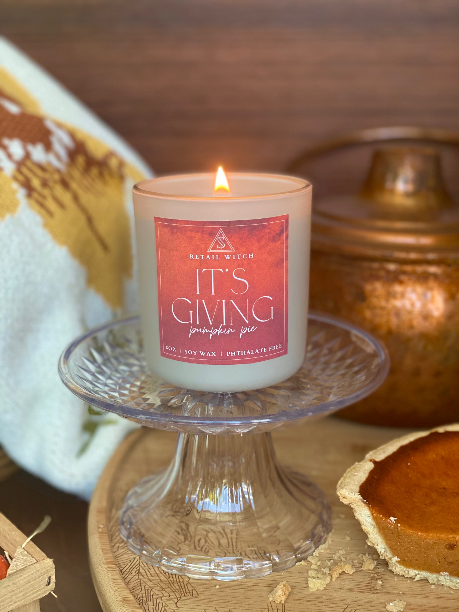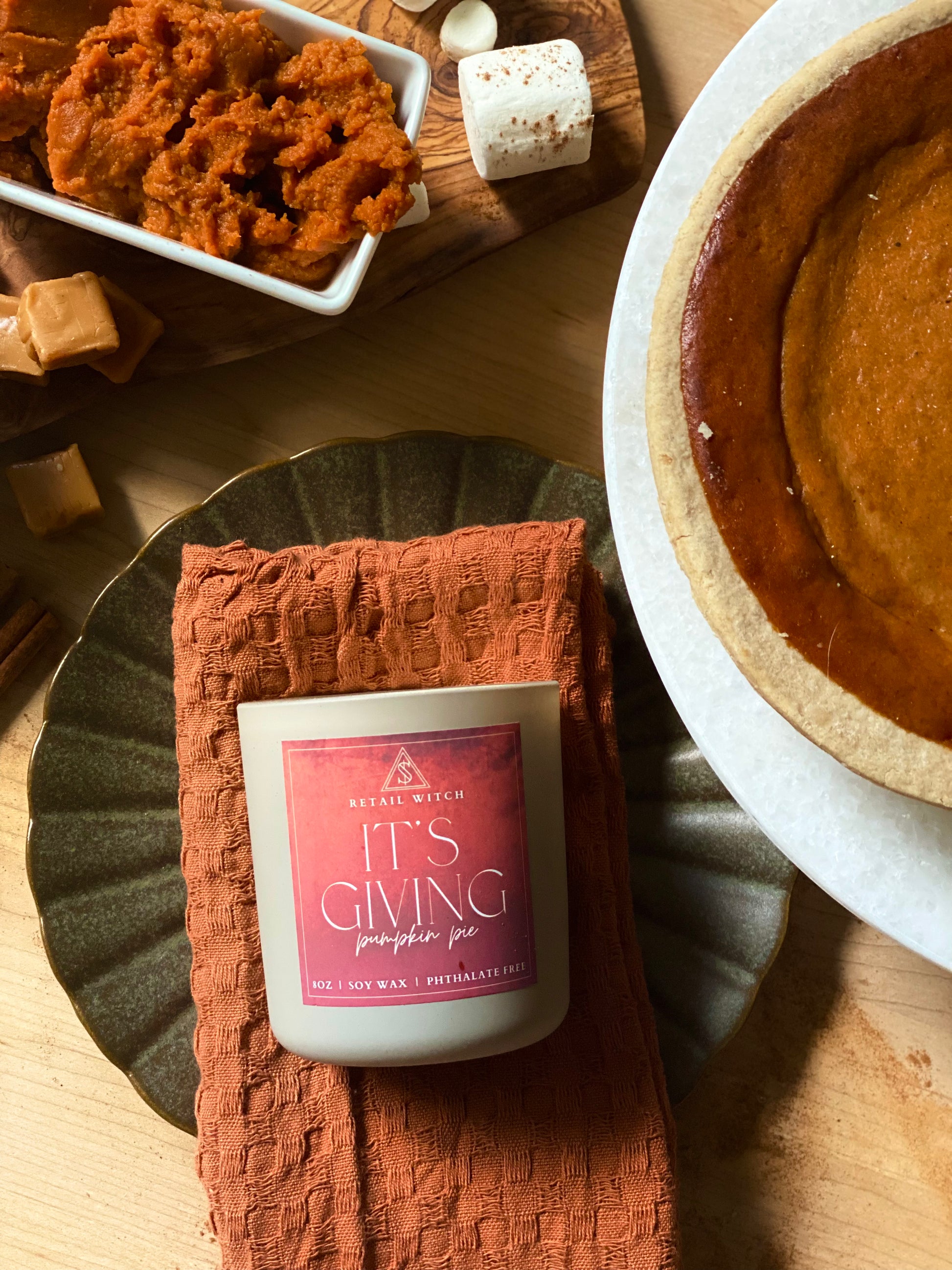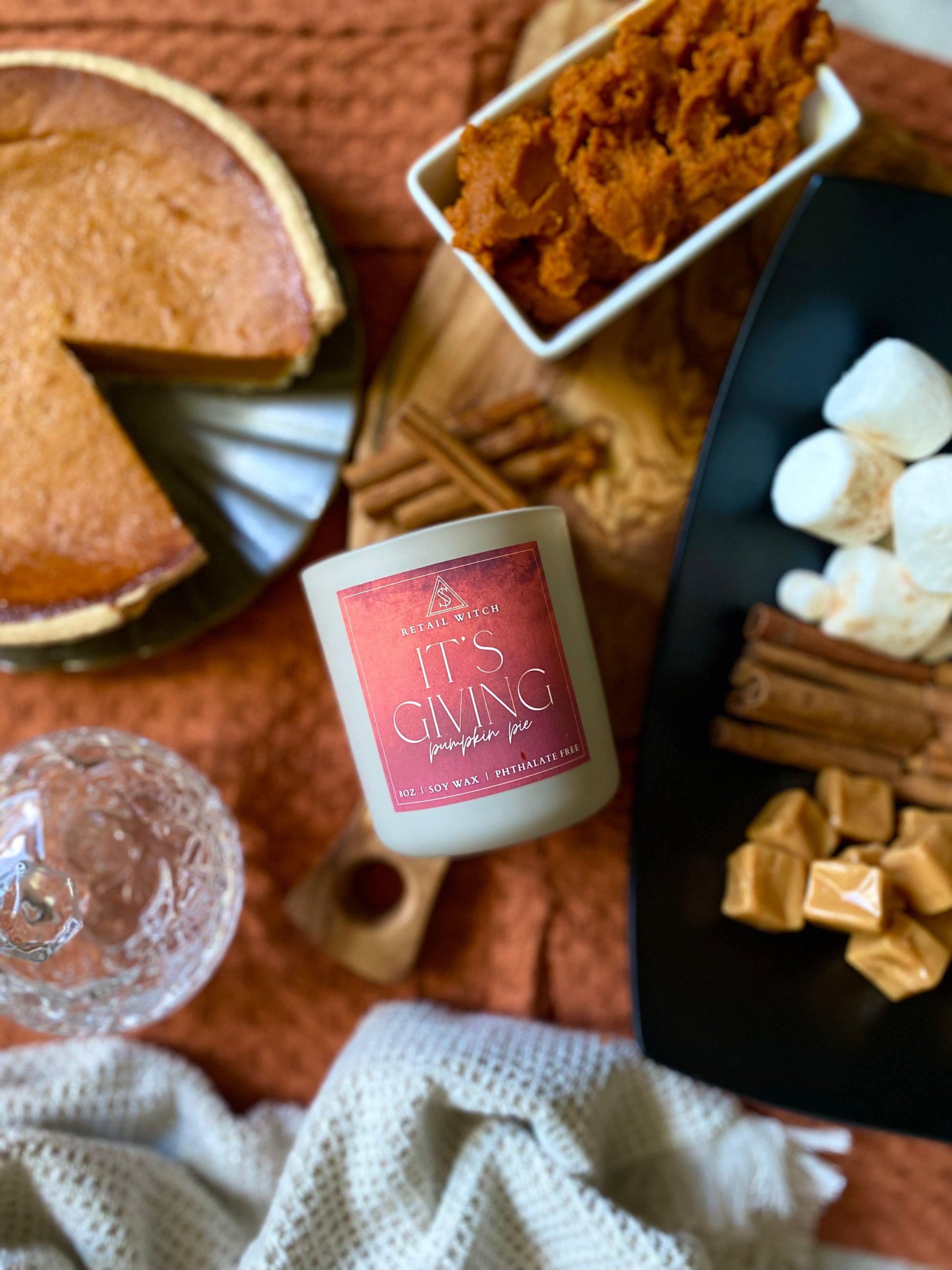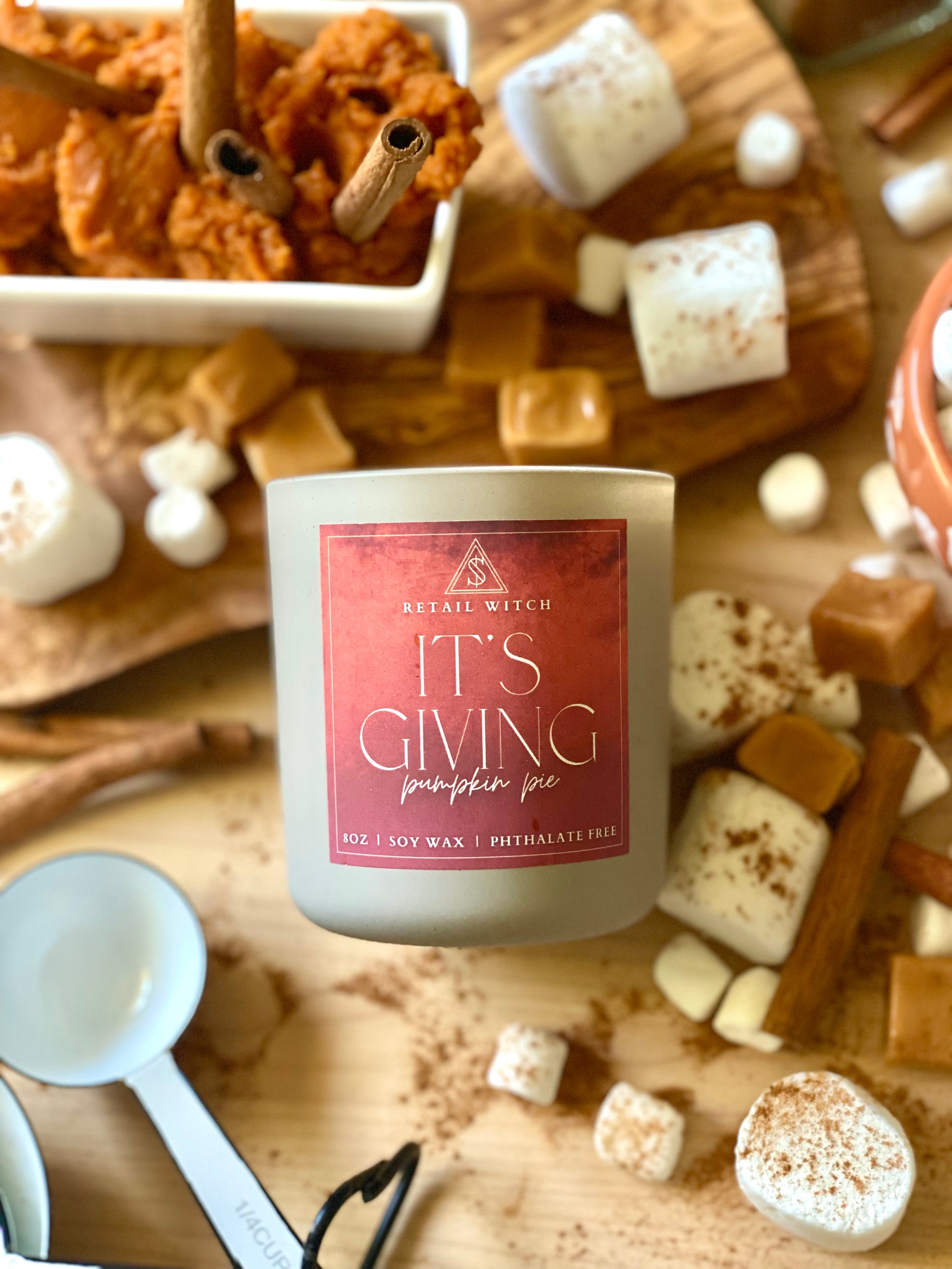 It's Giving that joyful, down to earth, fun loving gathering where the rich, creamy scent of pumpkin pie fills the air with warmth and cheer. This candle offers a perfectly balanced blend of spicy cinnamon, fluffy marshmallow, and smooth vanilla, creating an ambiance that is both heartwarming and down-to-earth, with a touch of caramel and soft musk for grounding, It’s Giving you all the cozy feels and best vibes for every gathering.