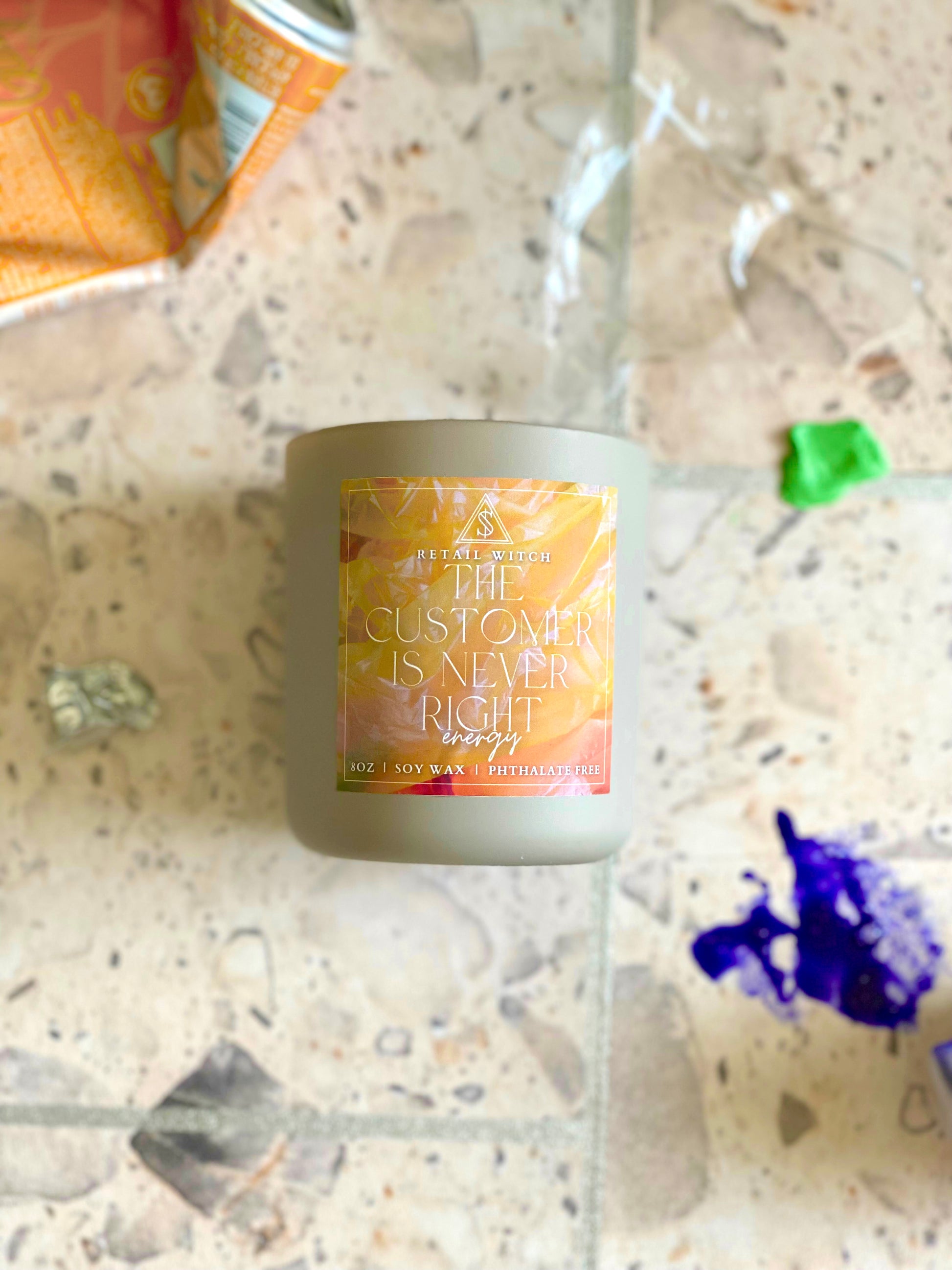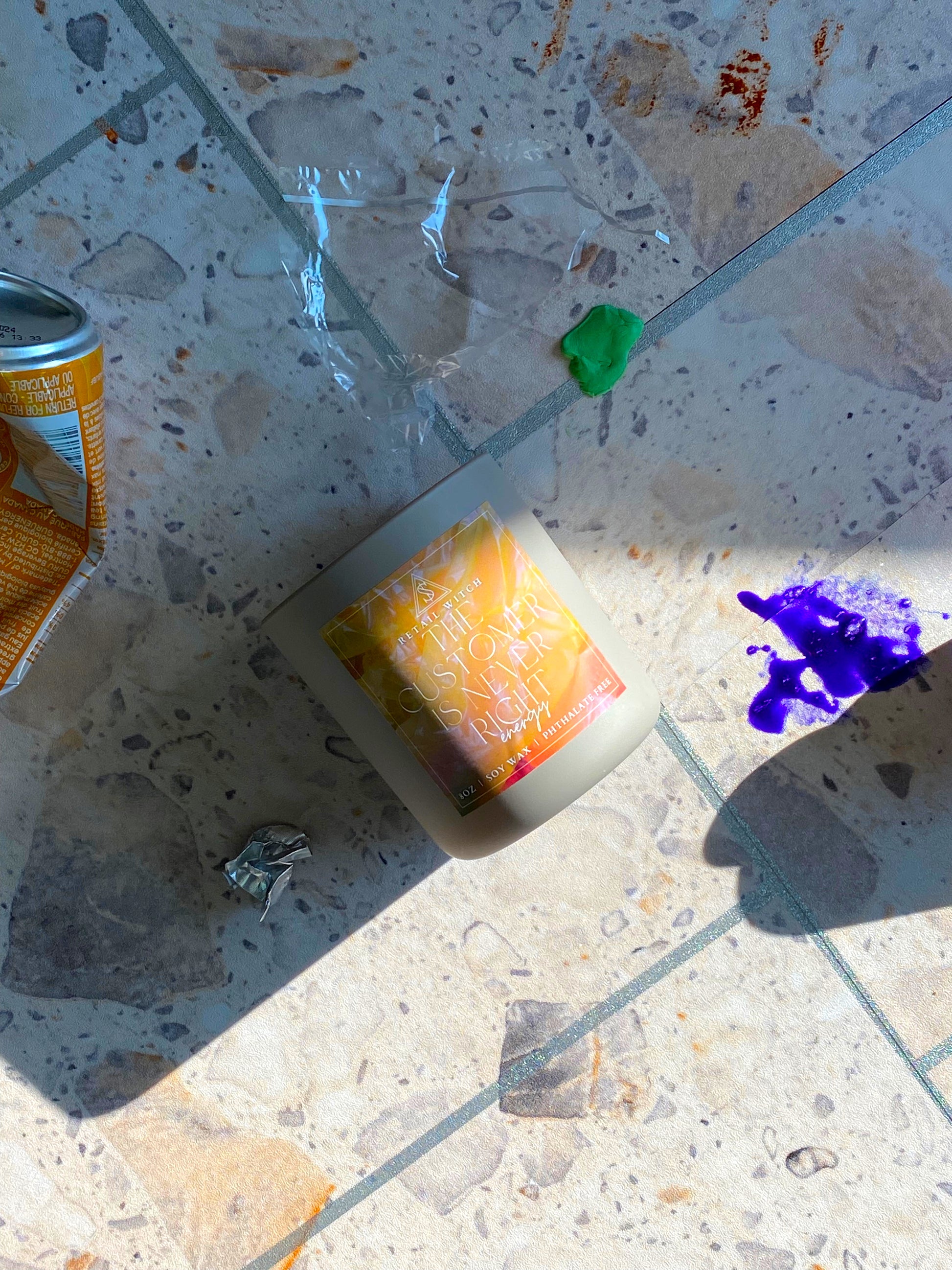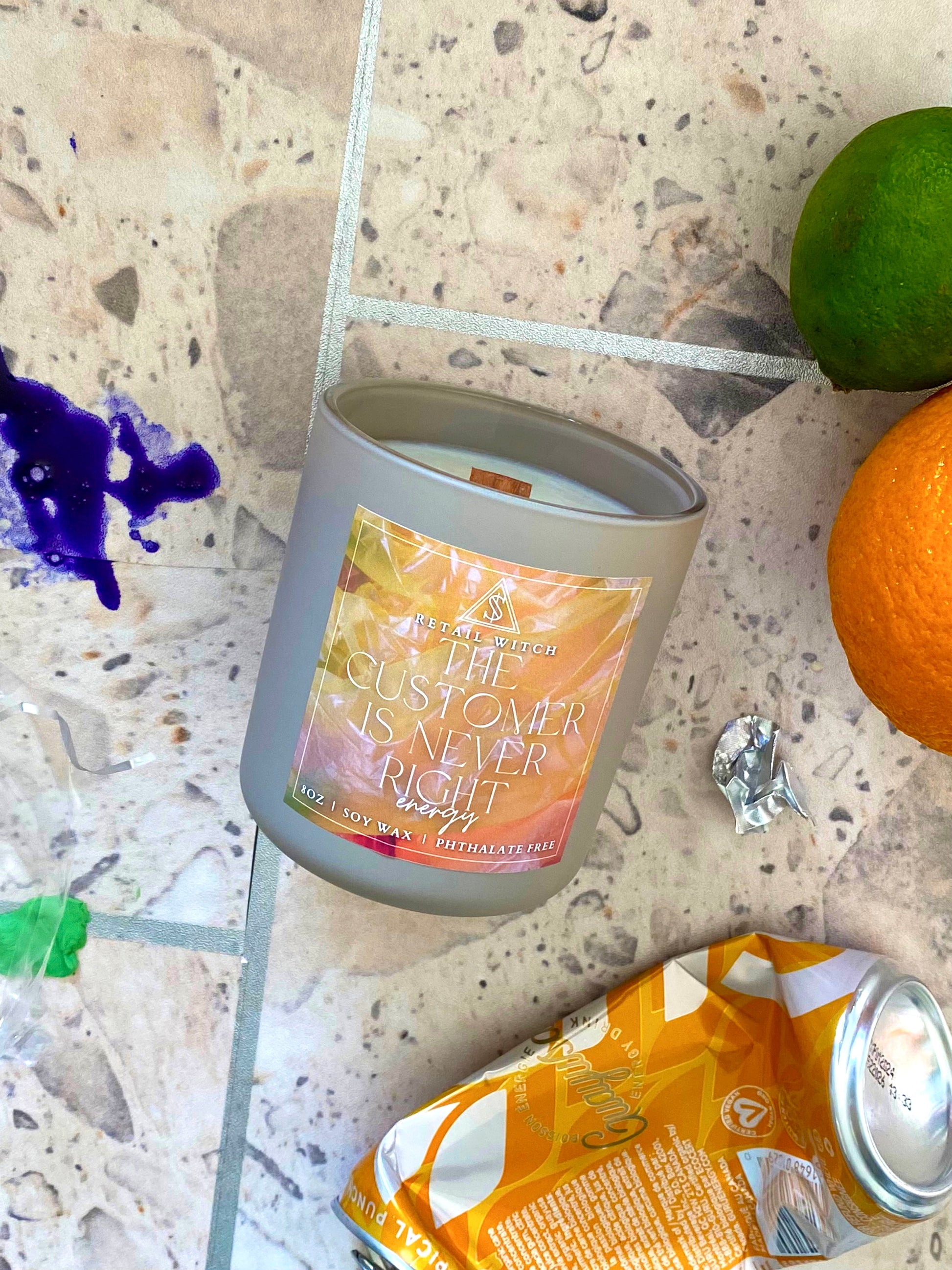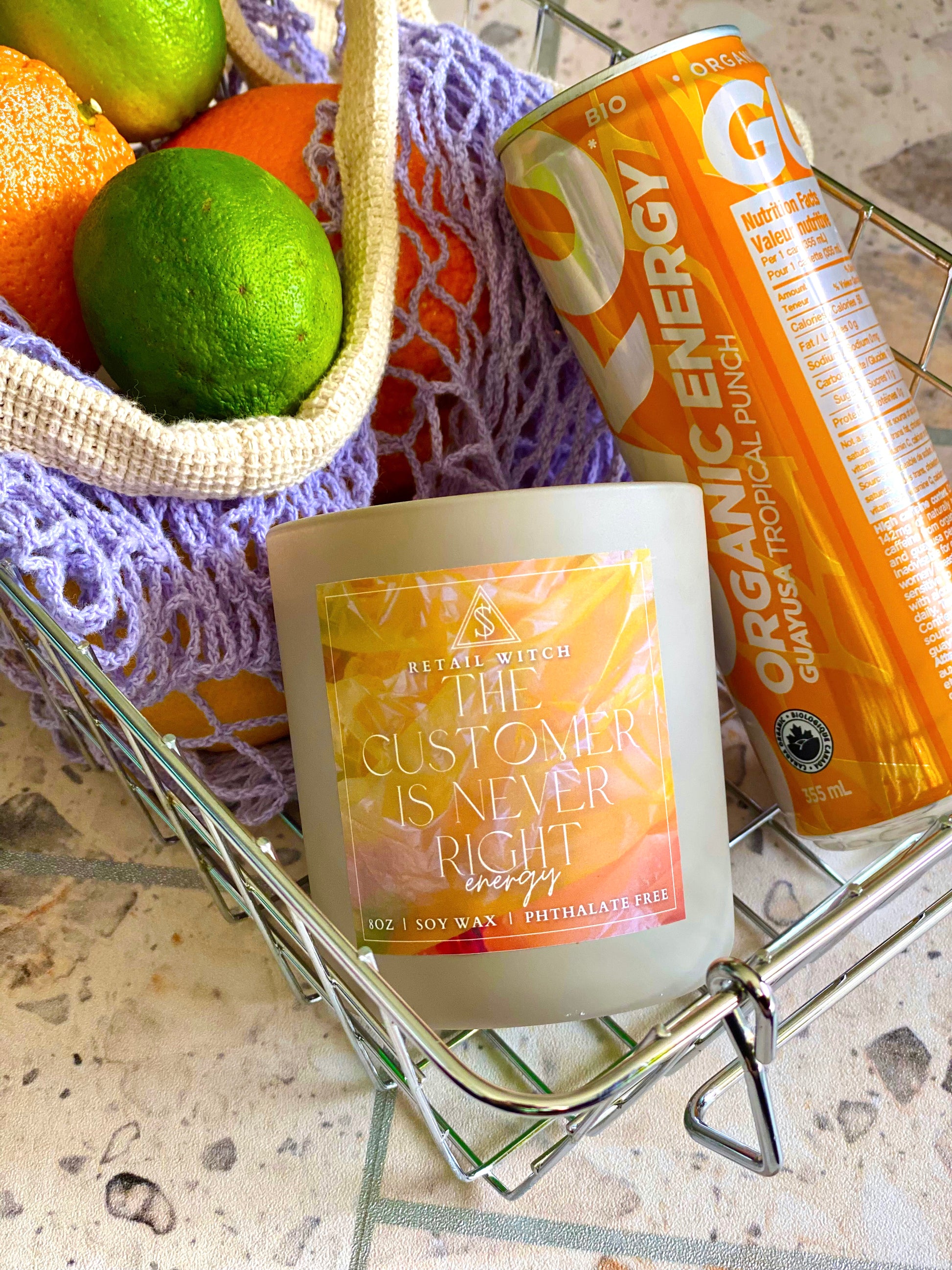 The contents of Karen's grocery bag freshly squeezed into a candle. More than a scent; it's an escape from reality, a burst of vitality; whether you're mentally preparing for a long shift or celebrating closing time, this invigorating citrus blend will rejuvenate your spirit.